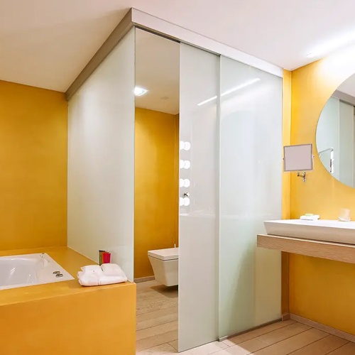 This bathroom project is for Ushuaia beach hotel in Ibiza Spain. It consists with two fixed glass panels and one sliding glass panel, and configurated with Klein Rollglass+ hardware kit