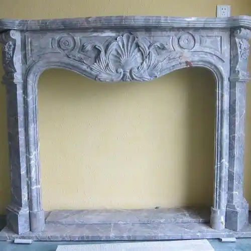 grey marble fireplace mantel with floral carving