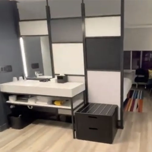 Bath vanities with backwall room divider with metal frame for Aloft by Marriott hotel