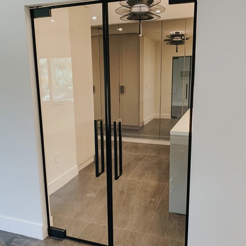 Interior door with clear glass and matte black hardware
