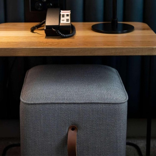 Upholstered ottoman with vinyl pull in Novotel hotel room