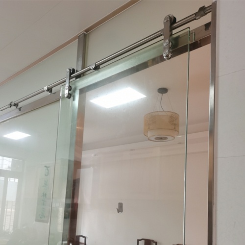 3. frameless glass sliding barn door with decorative exposed hardware to make the door stunning along with the 10mm thick tempered glass with many glazing options as tinted glass, printed glass, laminated glass, painted glass etc