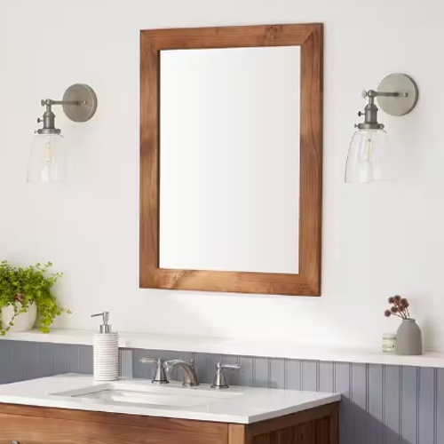 Farmhouse style rectangle walnut wood framed bathroom vanity mirror including mounting hardware