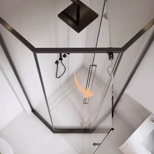 Diamond shape corner shower enclosure by clear tempered glass and architectural metal hardware for inward and outward swinging opening
