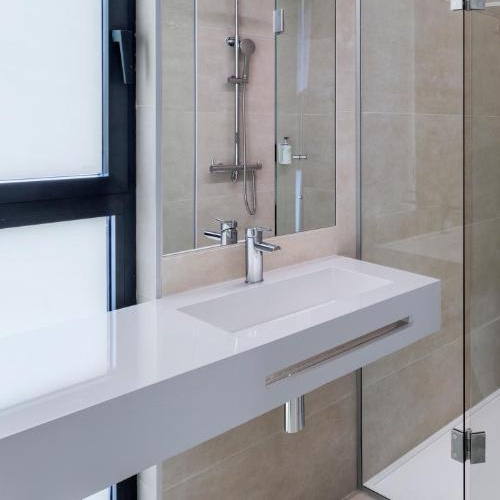 Floating bathroom solid surface counter and integrated basin for B&B hotel, welcome to send your bathroom design drawing to get a quote from our team