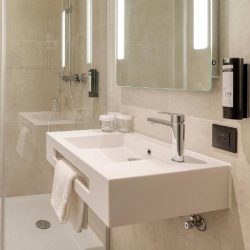 Floating bathroom solid surface counter and integrated basin for B&B hotel