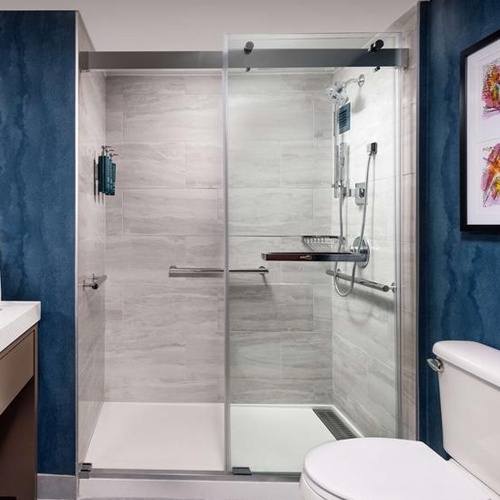 Glass shower door with antisplash threshold and solid surface shower base for Doubletree by Hilton