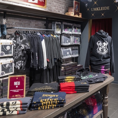 There are shopfitting elements throughout the store that allow visitors to immerse themselves in the magical world. For example, there is a cupboard with wands in the style of “Ollivanders”, an area inspired by “Honey Dukes”, an installation of the whomping willow, the invitation letter from Hogwarts, the talking hat, suitcases, cages, movie posters and, also, a fireplace with a seating area reminiscent of the common rooms. There are also special photo settings such as Platform 9 ¾ with the iconic trolley.