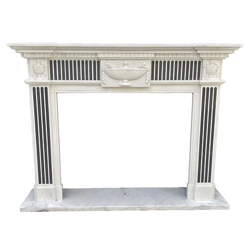 Beautiful solid white marble fireplace mantel with black inlayed fluting.