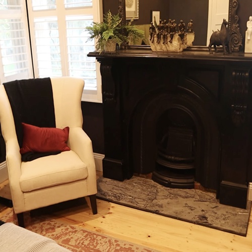 Black stone arched fireplace mantel in bedroom