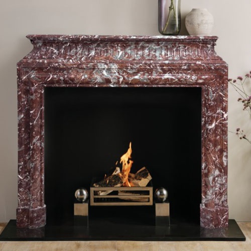 A classic bolection du Versailles silhouette with fluted frieze, elaborated at the corners by acanthus scrolls. This fireplace surround is shown in Rouge Royale Belgian marble,