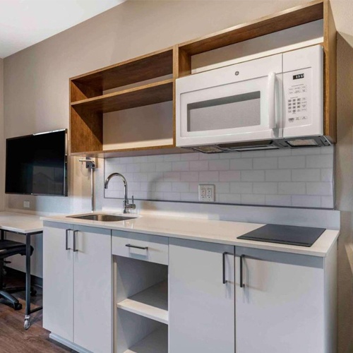 Small Kitchen Cabinetry and Countertop with Plumbing and Cooktop for extended stay hotel and apartment