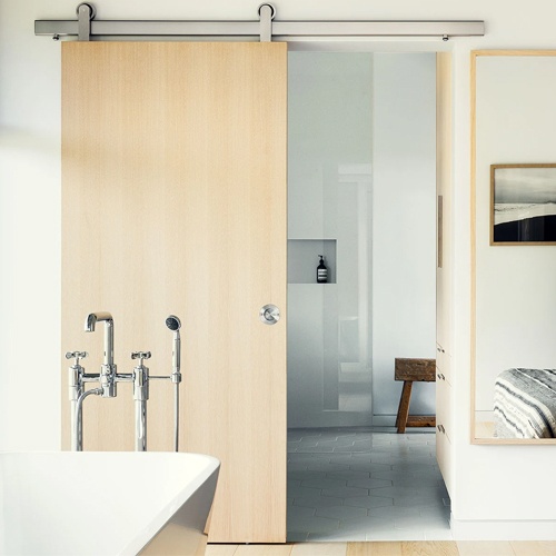 Sliding barn doors for hotel rooms available with wood door slab and glass door panel and reliable barn door mounting hardware kit